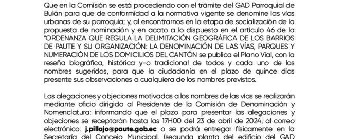 Para acceder a la información revisar los siguientes enlaces: https://www.paute.gob.ec/wp-content/uploads/2024/04/DENOMINACION-VIAS-BULAN-signed-paginas.pdf [...]