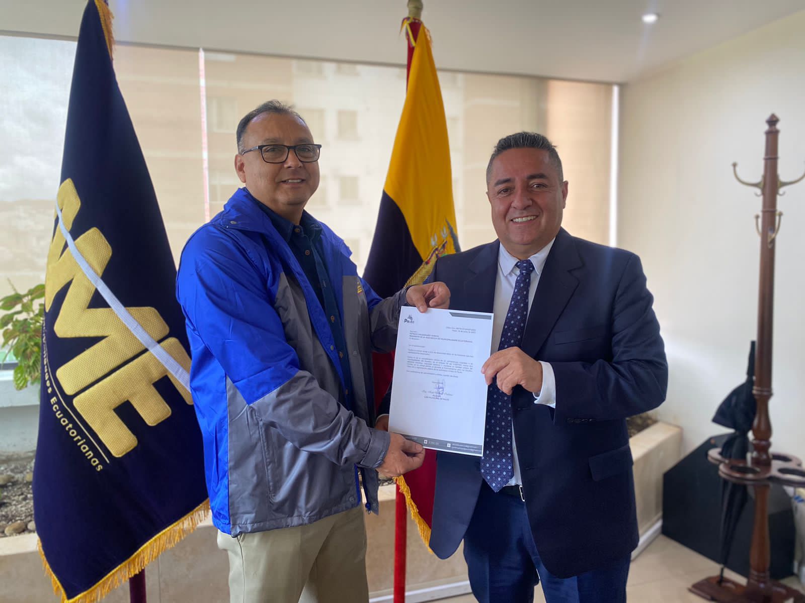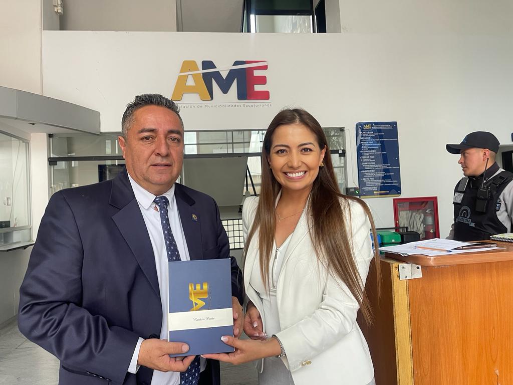 Durante la agenda de gestión que cumple en la ciudad de Quito, el Ing. Raúl Delgado, Alcalde de Paute, acudió a la oficina matriz de la Asociación de Municipalidades Ecuatorianas con el propósito de entregar al Abg. Johnny Firmat, Director Ejecutivo de AME, la solicitud para el financiamiento de los estudios de regeneración vial urbana que beneficiará a las siete parroquias rurales de Paute.