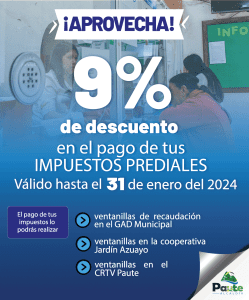 ¡Es momento de ponerte al día con el impuesto predial! No dejes pasar esta oportunidad que otorga la ley. Acércate a las ventanillas de recaudación, ubicadas en los bajos del edificio Municipal del GAD de Paute, de lunes a viernes, de 08:00 a 16:00.