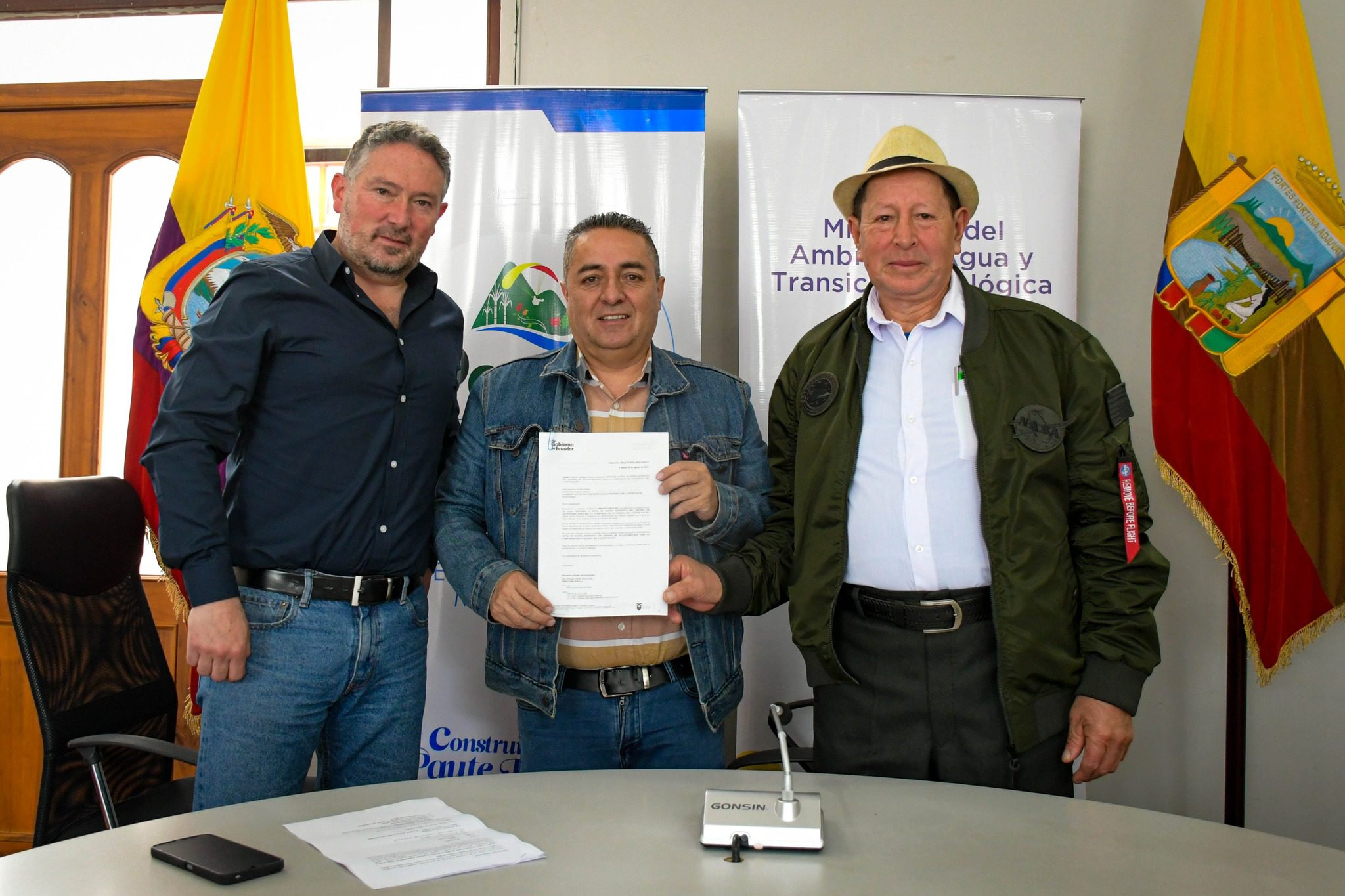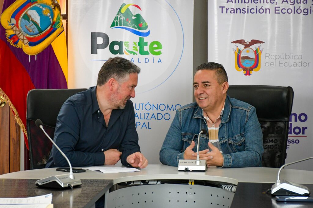 En la Sala de sesiones del GAD Municipal de Paute, el Ing. Giordano Torres Piedra DIRECTOR ZONAL 6 del Ministerio de Ambiente, Agua y Transición Ecológica, MAATE, entregó al Ing. Raúl Delgado, Alcalde de Paute, la viabilidad técnica ambiental para la ejecución de los Estudios del Sistema de Alcantarillado de Ucumarina perteneciente a la parroquia Guarainag. Además, se facilitó las aprobaciones de los Términos de Referencia de los siguientes estudios:
