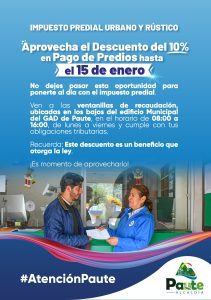 ¡Es momento de ponerte al día con el impuesto predial! No dejes pasar esta oportunidad que otorga la ley. Acércate a las ventanillas de recaudación, ubicadas en los bajos del edificio Municipal del GAD de Paute, de lunes a viernes, de 08:00 a 16:00.![]()
