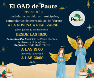 El Municipio de Paute hace la cordial invitación para todos los ciudadanos, servidores municipales y comerciantes del mercado 26 de febrero para la Novena Navideña.
